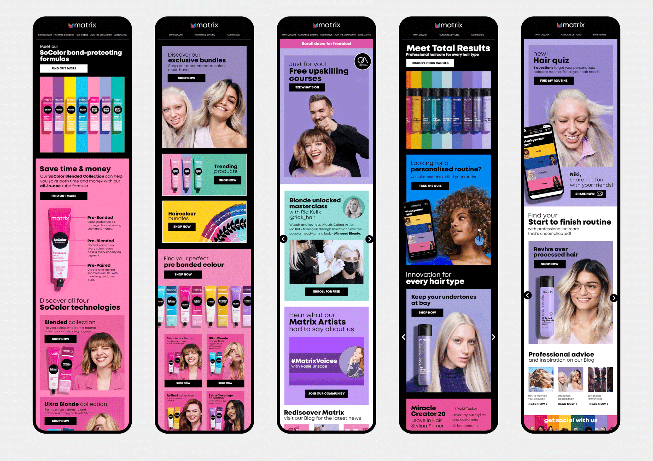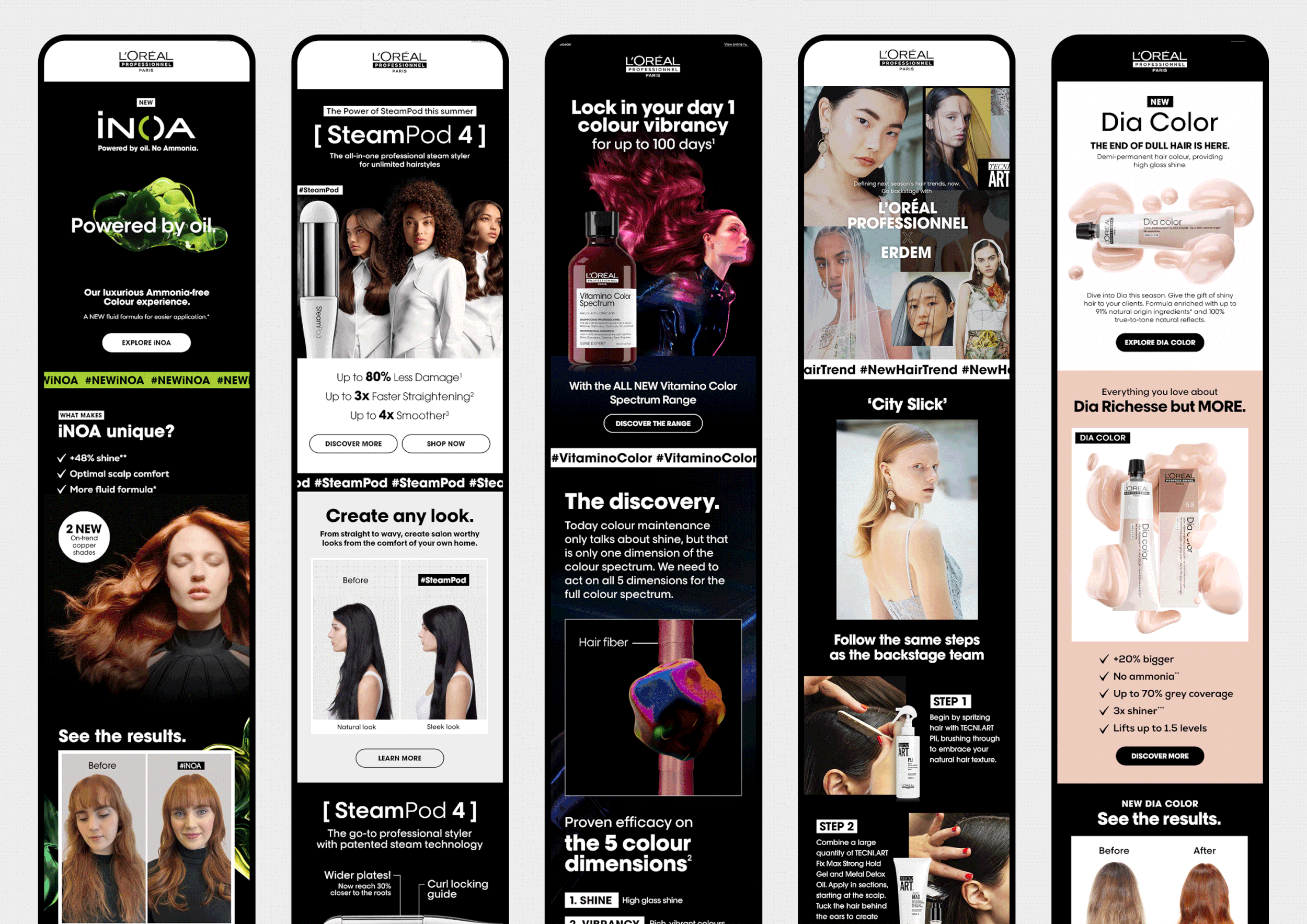 Working primarily on CRM communications, I designed across several divisions – from haircare and colour for consumers to technical tool launches and educational content aimed at salon professionals. While global guidelines provided a solid framework, there was always room to innovate and adapt campaign content to best suit CRM channels.