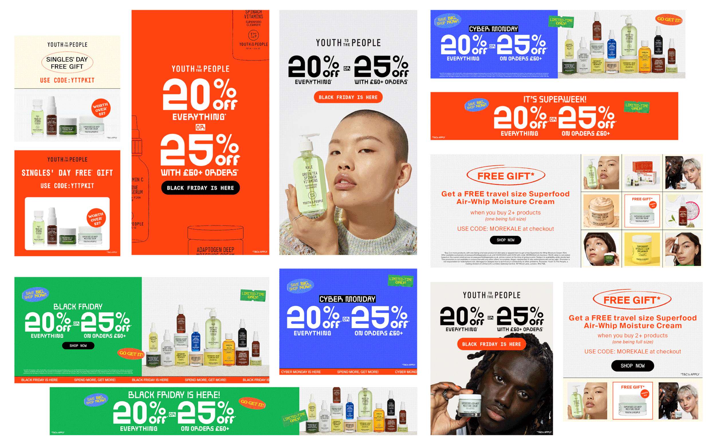 Working in collaboration with the UK online marketing team, I was given creative ownership of bringing the brand to life across weekly launches, promotional activity, trigger campaigns, and key annual moments including Black Friday, seasonal holidays, and loyalty events. I created from initial concept through to CRM, on-site, paid media and in-store digital screens and printed items ensuring a cohesive and impactful brand presence across all touchpoints.